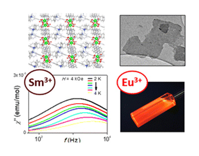 Three novel coordination polymers - [LnLNO3(o-Phen)] (Ln: Eu(III) (1), Sm(III) (2)) and [Eu2L3EtOH(H2O)3].1.5EtOH.H2O (3) - were synthesized by reacting the respective lanthanide nitrates with the organosilane dicarboxylic acid bis(p-carboxyphenyl)diphenylsilane (H2L) with or without o-phenanthroline (o-Phen) as coligand. The o-Phen-assisted route yielded isostructural one-dimensional coordination polymers (CP) 1 and 2, incorporating both ligands and the nitrate anion. These ribbon-like chains assemble into hydrogen-bonded 2D networks that further stack into 3D architectures through non-covalent interactions. In contrast the o-Phen-free conditions produced the 3D CP 3, based solely on H2L, with ethanol and water molecules retained in the lattice. All three architectures are highly dense, with free volumes of only 2.7% (1, 2) and 11.0% (3). Photophysical studies reveal an exceptional quantum yield of 67% for Eu-based complex 1 attributed to complete ligand-to-Eu energy transfer. In contrast, the Sm-based compound 2 achieves a modest 2% quantum yield, while compound 3 reaches 8%. Magnetic measurements confirm typical Van Vleck paramagnetism for Eu3+ in 1 and 3, with spin-orbit coupling constants of Λ = 379 and 352 cm−1, respectively. The magnetism of the Sm-based CP 2 is governed by its ground 6H5/2 and first excited 6H7/2 multiplets (Λ = 310 cm−1), and notably displays field-induced slow magnetic relaxation. Remarkably, Eu-based CP 1 affords exfoliation by sonication into nanometric flakes that retain a high quantum yield of 57% upon deposition, opening up exciting opportunities for surface-integrated sensing, photonic, and quantum applications.